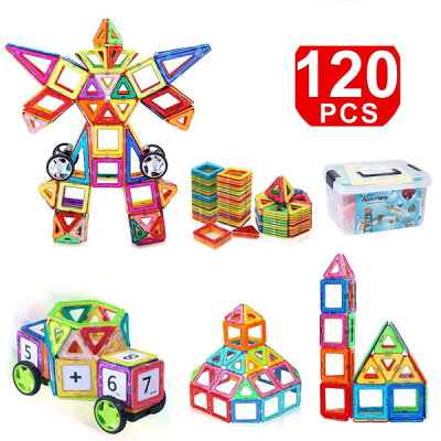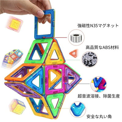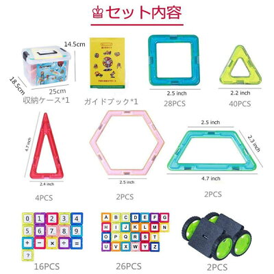 ●商品説明 ・豊かなセット内容、収納ケース付き: 120pcsのマグネットブロックセットには、40pcs*三角形、28pcs*正方形、2pcs*六角形、2pcs*台形、4pcs*長三角形、26pcs*アルファベットプレート(非磁性)、16pcs*数字カード(非磁性)、2pcs*車輪、ガイドブック(日本語)。