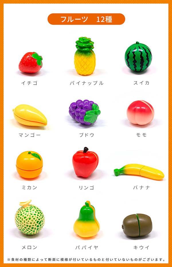 フルーツ、野菜が各12種類 バリエーション豊かな品数 食卓によく出る野菜から、南国のフルーツまで バラエティに富んだ品揃え。